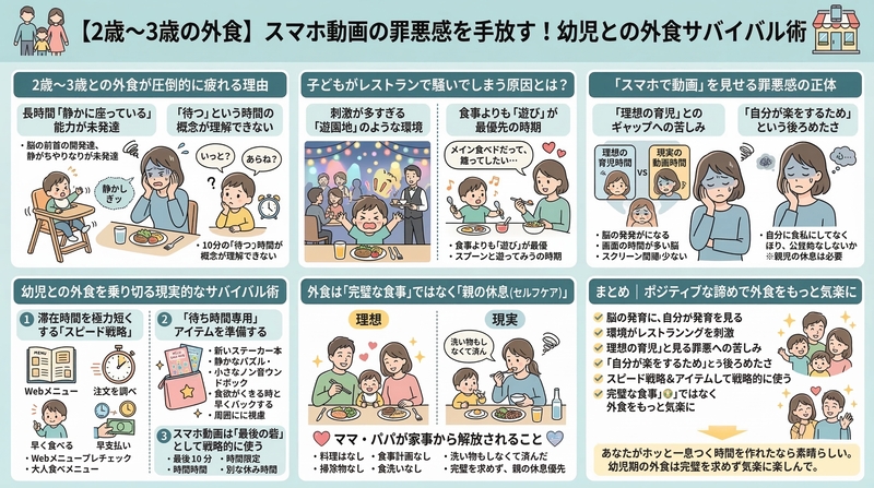 結論から言えば、2〜3歳の子どもとの外食がサバイバルになるのは「ごく普通のこと」です。この記事では、幼児との外食が疲れる根本的な理由、子どもがレストランで騒ぐ原因、スマホ動画に頼ってしまう罪悪感の正体、そして外食を乗り切るための具体的なサバイバル術について詳しく解説します。