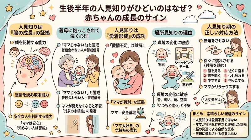 生後半年頃に始まる人見知りは、多くのママにとって悩みの種です。義母に抱っこされて泣かれたり、場所見知りで外出が大変になったりすると、「自分の育て方が悪いのかな」と自分を責めてしまいがちです。