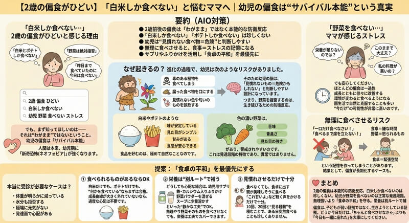 2歳前後の子どもが偏食をするのは、決して「わがまま」や「親のしつけ不足」ではありません。この時期の偏食は、進化の過程で身につけた本能的な防衛反応の一つです。
