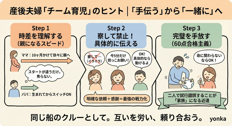 「今日は本当に眠くて無理」「実は、この子の夜泣きが辛くて不安で仕方がない」と、お互いに鎧を脱いで弱音を吐ける関係こそが、長期戦である育児を乗り切る強いチームの条件です。