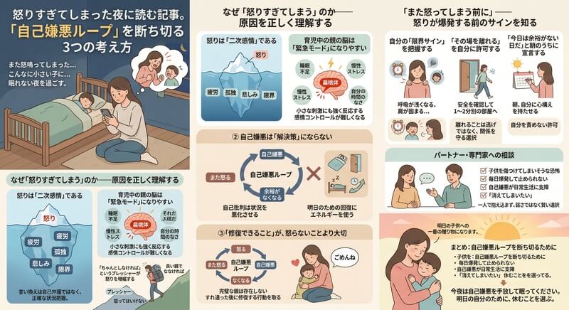 自己嫌悪は感情の消耗をもたらし、翌日の余裕をさらに削ります。余裕がなくなると、また怒りやすくなります。その結果、また怒って、また自己嫌悪になる——ループはむしろ強化されます。