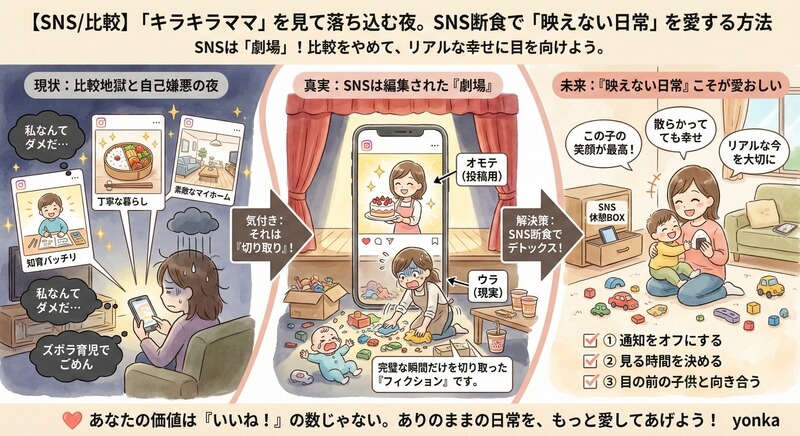 SNSに振り回されず、自分らしい育児を取り戻すためのヒントをお届けします。