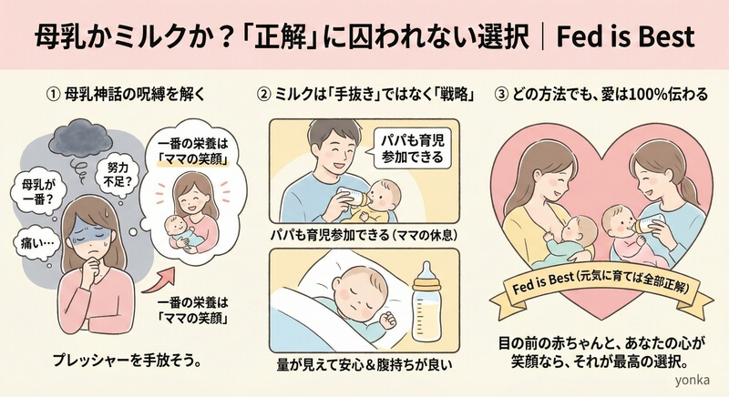 yonkaが一番伝えたいこと。それは、育児の目的は「母乳をあげること」ではなく、「赤ちゃんを元気に育てること」だという事実です。