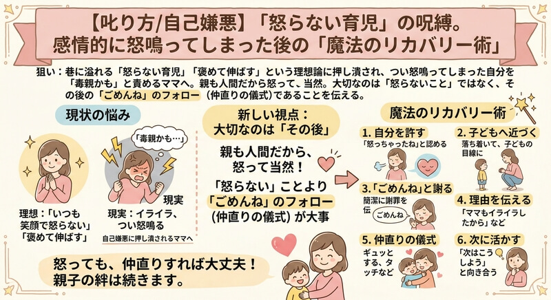 この記事では、「怒らない育児」という理想に縛られ、限界を感じているママ・パパに向けて、怒鳴ってしまった後の自己嫌悪との向き合い方と、親子関係を修復する「魔法のフォロー術」について詳しく解説します。完璧な親を目指すよりも大切な、「リカバリー(修復)」の力を身につけましょう。
