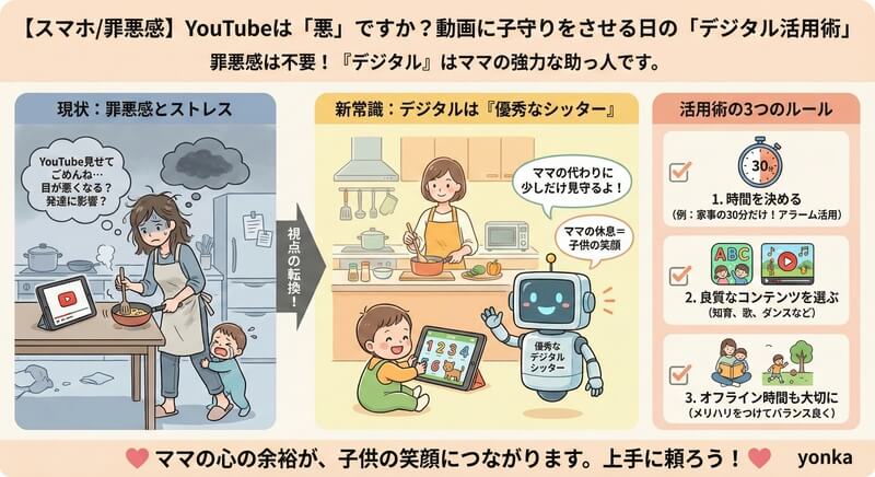 YouTubeを「育児を手抜きするための道具」と捉えるから、罪悪感が生まれるのです。そうではなく、**「親が人間らしく生活し、家庭の安全と平和を守るための、極めて優秀な育児補助ツール」**と捉え直してみましょう。