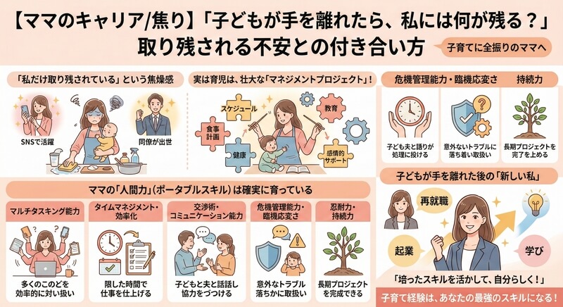 この記事では、多くのママが抱える「社会から取り残される」という感覚の正体と、その乗り越え方について深く掘り下げていきます。育児経験が、実はあなたの市場価値を高める貴重な「実践の場」であることを理解し、焦りを未来へのエネルギーに変えるヒントを見つけていきましょう。